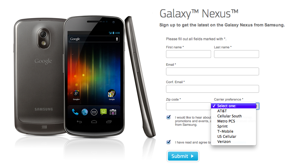 On the product page for the Galaxy Nexus that was released yesterday there is a signup form to get more information on the device before it is available in November. The signup form hints to seven new carriers that the Galaxy Nexus will be listed on.
