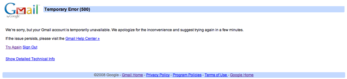 Those who tried to access Gmail.com directly found the following “Temporary Error (500)” notice with a “93” numeric technical code: