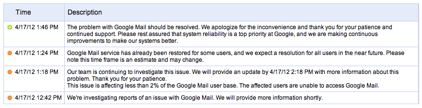 The service interruption only affected 2 percent of Gmail’s user-base. DownRightNow, a universal monitoring service for the Web that is similar to Google’s Dashboard, described the outage as a “widespread service disruption” that started somewhere between 12:40 p.m. and 12:59 p.m. EST. The service interruption did not seem to affect mail pushing to third-party clients.