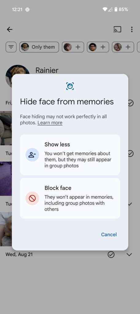 The tool offers two strengths: Show less and Block face entirely. The latter will hide all photos of that person even if they appear in groups, and the former will still show group photos with that person involved.