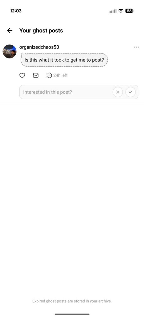 Once posted, you’ll be able to find your content in your profile. It’s hidden in a new ghost posts section. The posts themselves are highly noticeable because they’re outlined in a dashed border. All of them also have a time indicator at the bottom to show just how much of that 24-hour timeframe has passed. Once that’s up, they get sent to your archive.