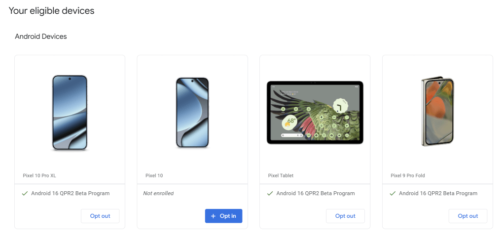 To get set up with beta releases of Android 16, you’ll visit google.com/android/beta and “Opt in” on your selected device. Any compatible Pixel (listed above) with your same Google account will be able to join the program on this page. Once opted in, you’ll be able to check for updates on your device to actually install the update. This usually happens within a few minutes to an hour, but can occasionally take longer.