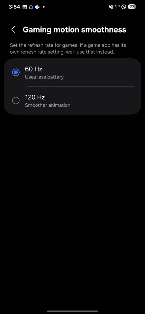 As spotted by SammyGuru, you can now set a default refresh rate for games, locking them at either 60Hz (for better performance and battery life), or 120Hz for smoother gameplay.