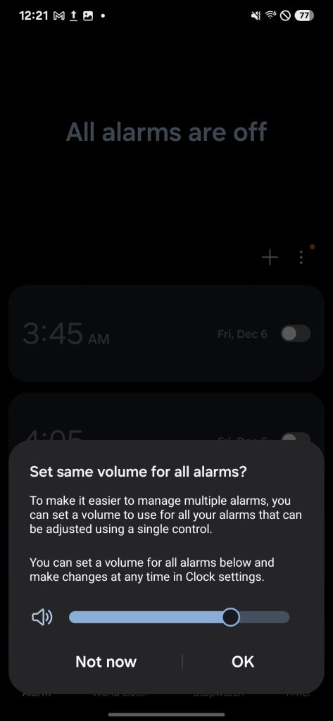 Samsung’s Clock app can now set the same volume across all alarms while also being able to create groups of alarm times that can be turned off or on all at once.