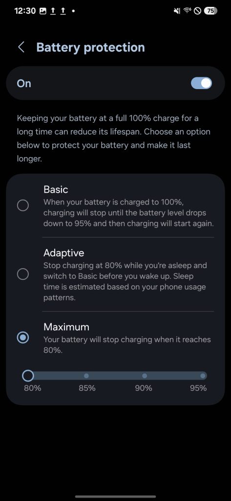 When you turn on Battery protection, you can now adjust the maximum charging level anywhere between 80% and 95%.